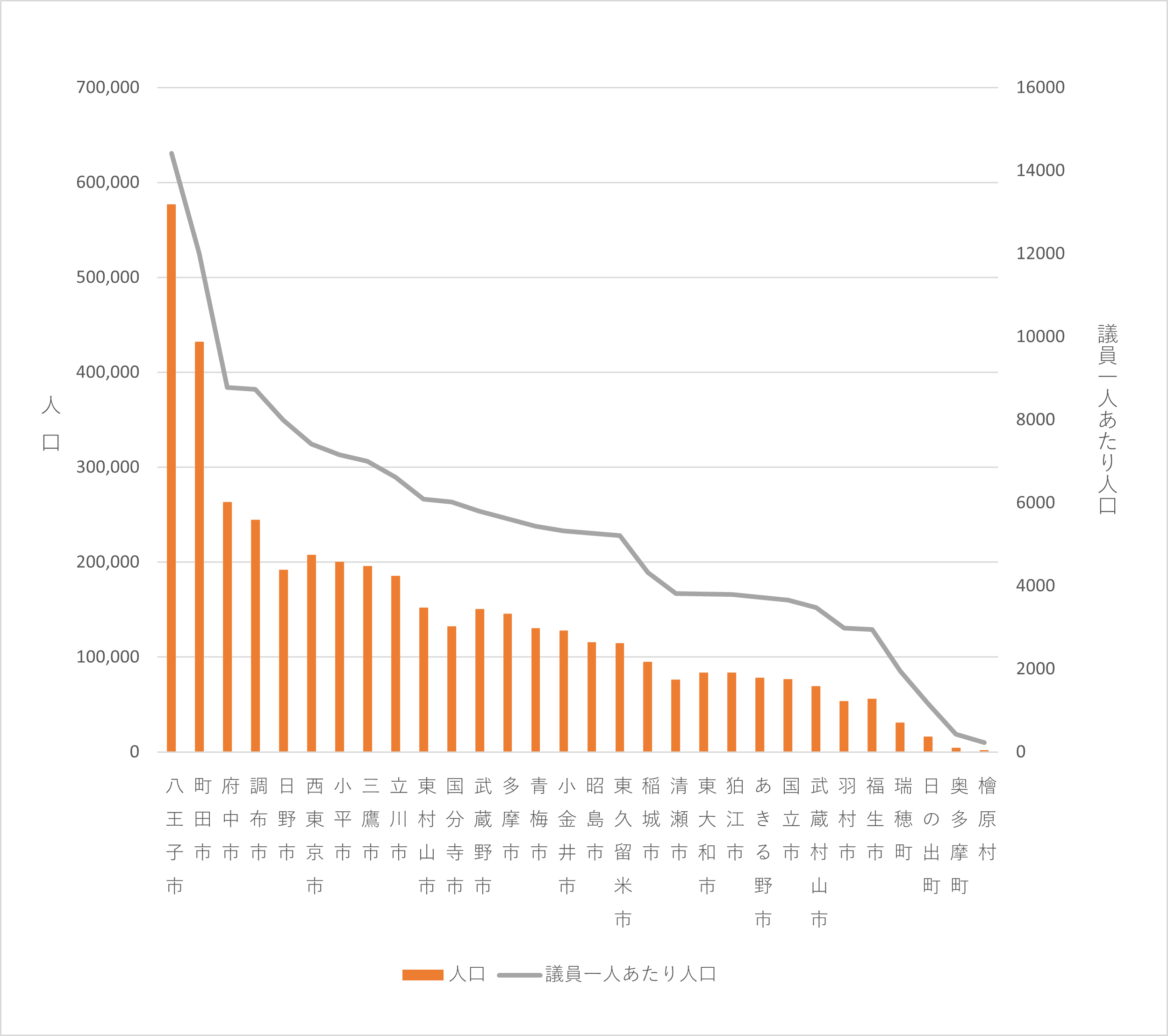 多摩地域で議員定数が最も多い八王子市(40議席)は、最も少ない檜原村(8議席)の5倍ですが、人口で比較すると300倍以上の差があります。人口規模の大きい自治体ほど、議員1人あたりの人口が増加する傾向にあり、これはつまり議員1人あたりの負荷が大きくなっていることを示しています。これは、先述の都道府県議会のデータと同様に全国的な傾向です。