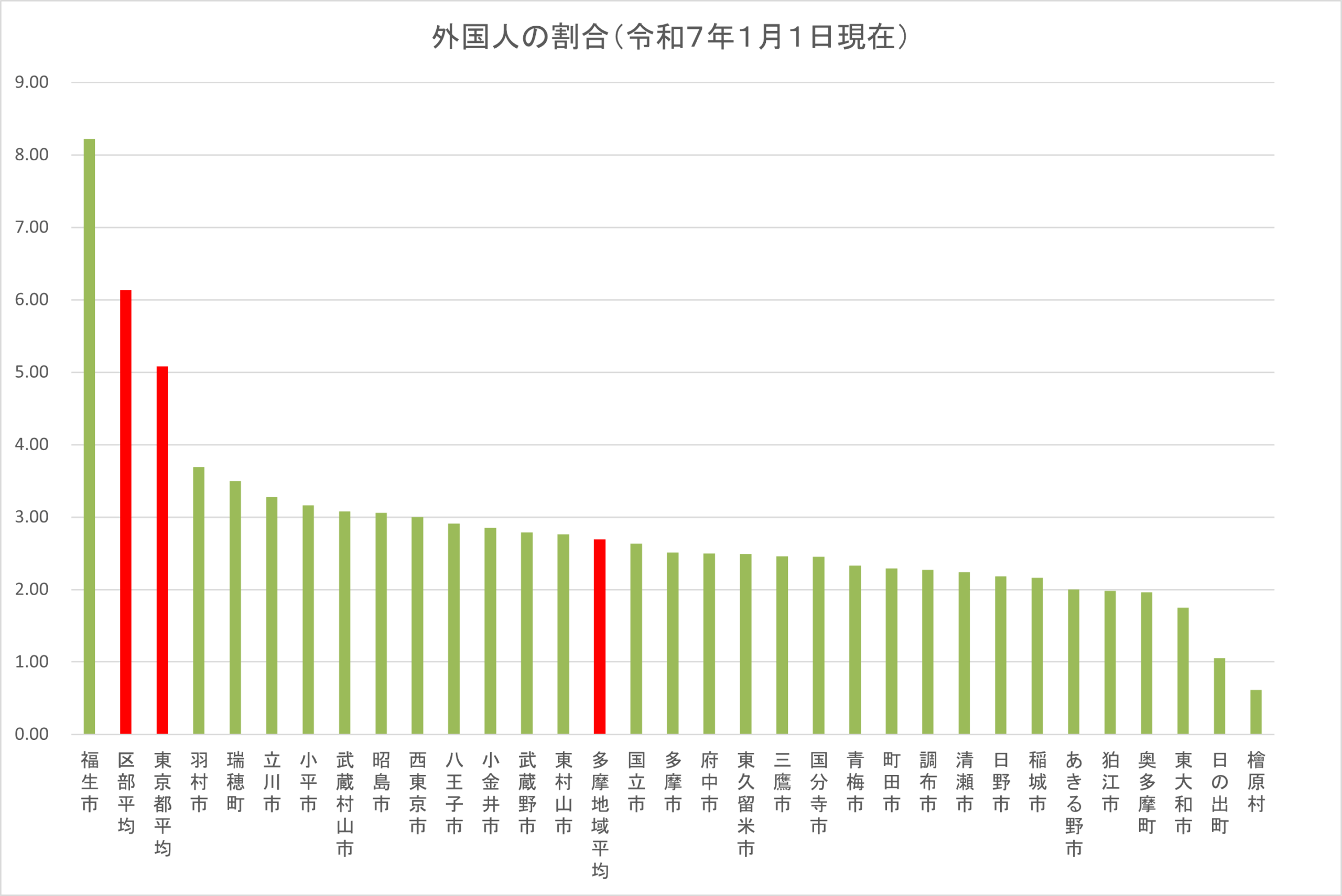 八王子市を除く南多摩や、横田基地に隣接していない西多摩地域は、外国人割合が比較的少ない傾向です。