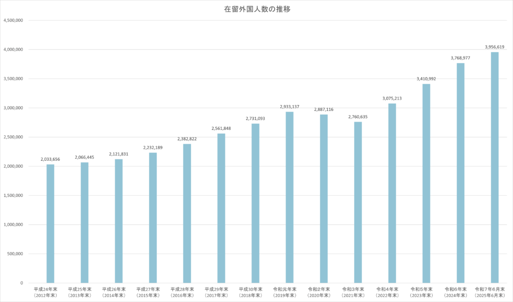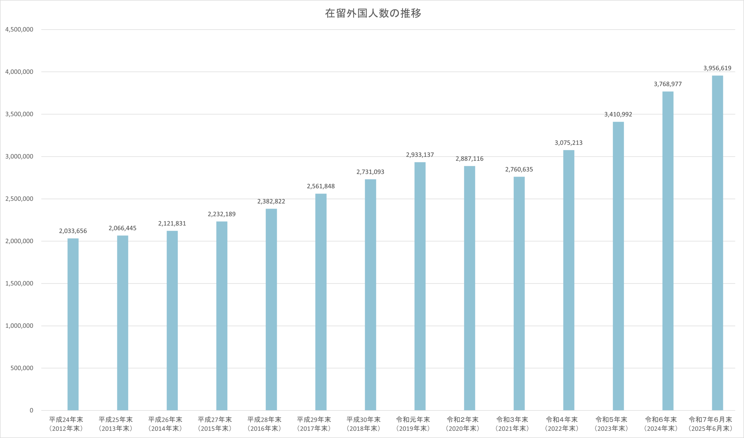 出入国在留管理庁によると在留外国人数はコロナ禍を除いて年々増加しており、令和7年6月末時点で395万6,619人に上ります。