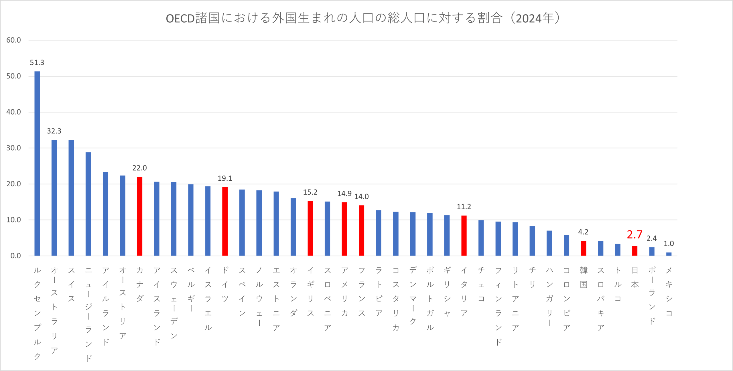 OECDの「International Migration Outlook 2025」によると、2024年時点の「OECD諸国における外国生まれの人口の総人口に対する割合」で、日本は38カ国中36番目と、わずか2.7%です。OECDの平均値が15.3%であるため、日本は5.7倍もの開きがあります。