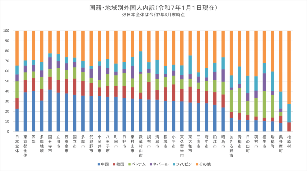 東京都全体と比較すると、多摩地域は中国人の割合がやや低く、ベトナム人とフィリピン人の割合が高くなっており、これは日本全体の傾向に近いと言えます。この結果から、23区の特異性が明確に見て取れます。