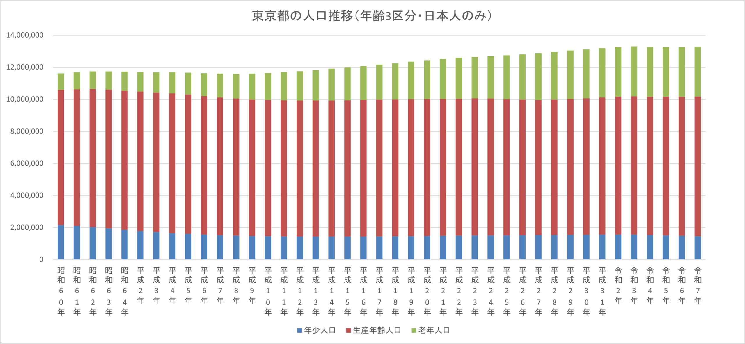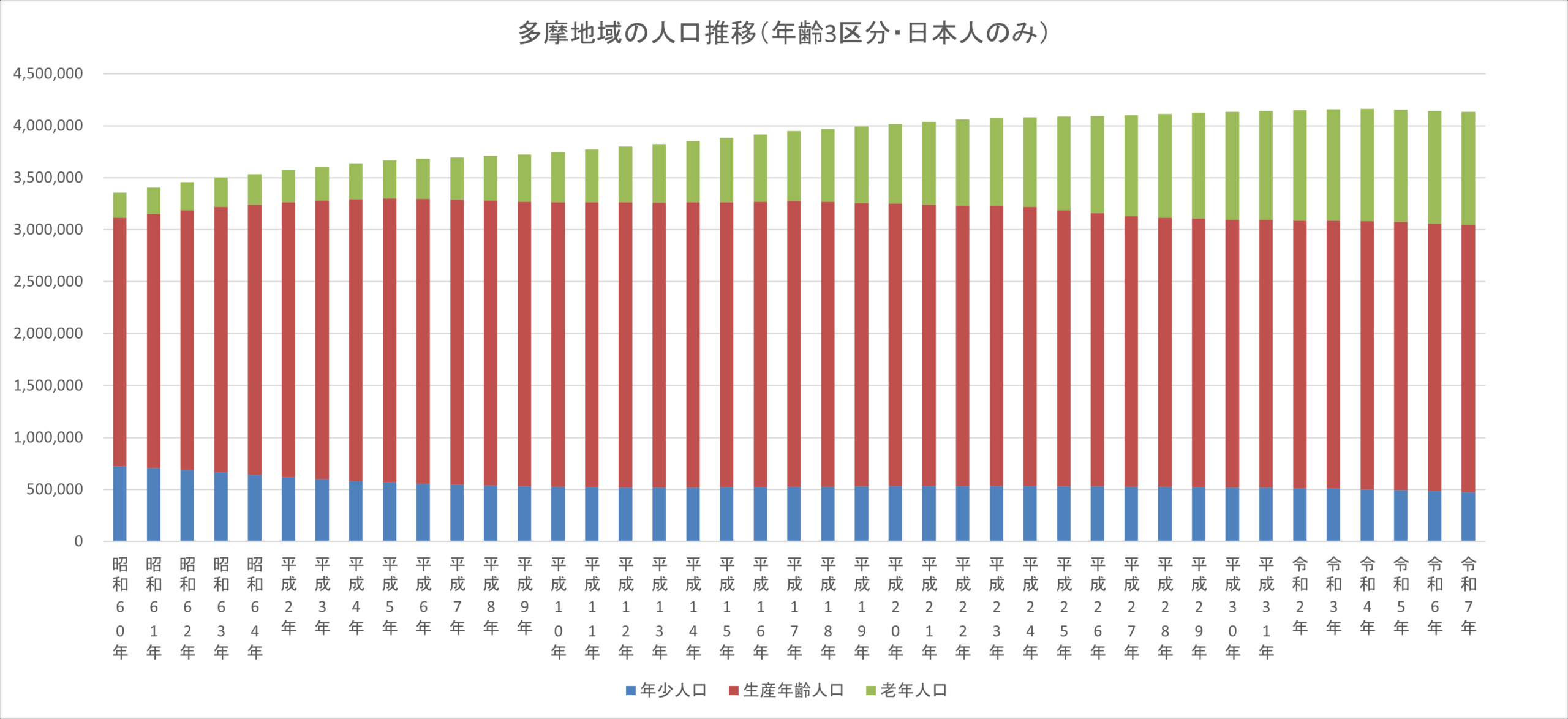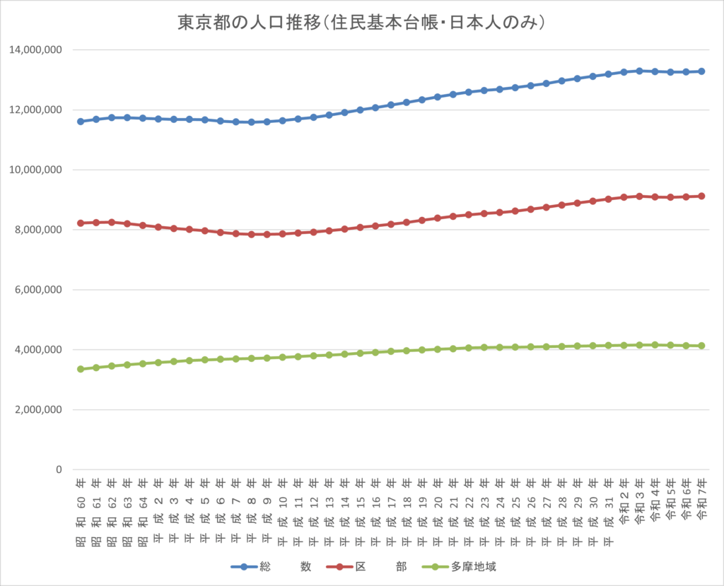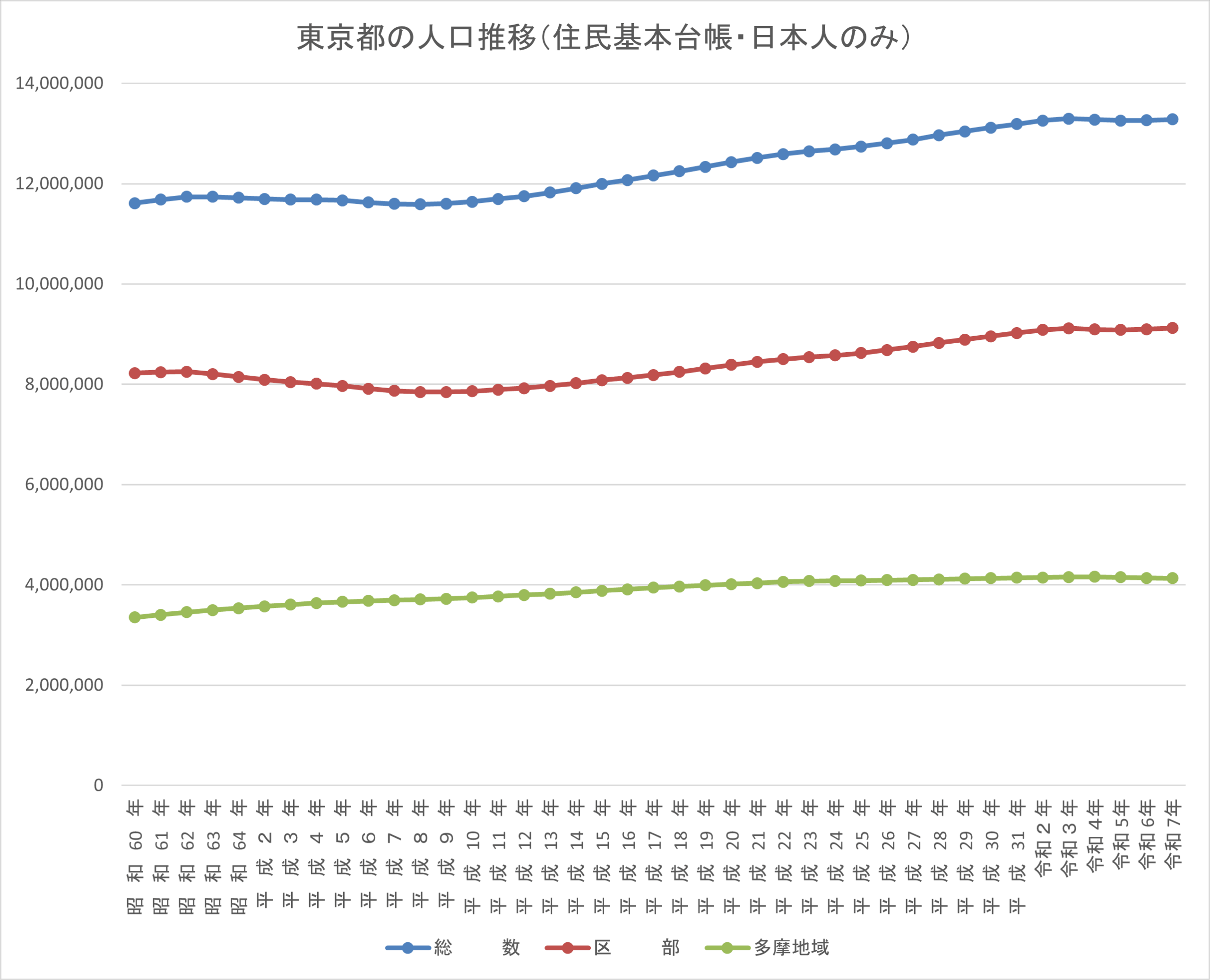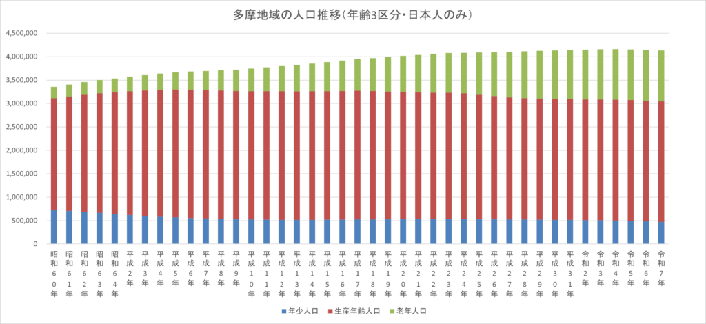 多摩地域の人口(外国人含む)は、2025年(令和7年)に424万8,710人と過去最高を記録しました。しかし、日本人のみに限定すると、2022年(令和4年)の416万362人をピークとして、すでに減少傾向にあります。