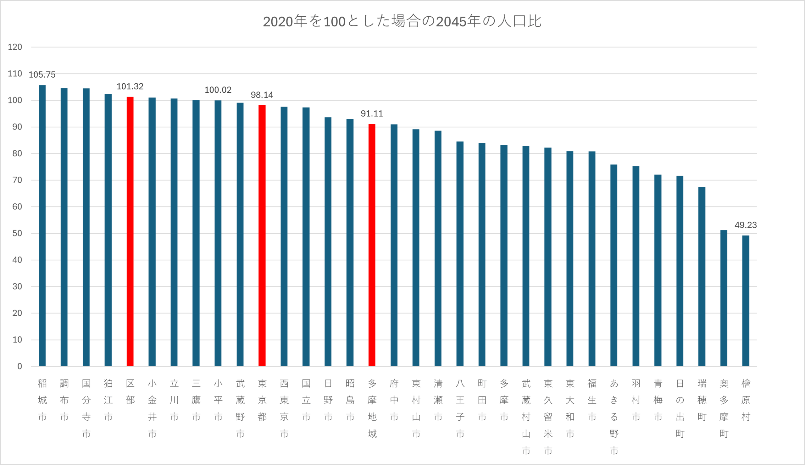 対照的に、奥多摩町と檜原村は減少率が著しく、25年間で人口が約半減する予測が出ています。