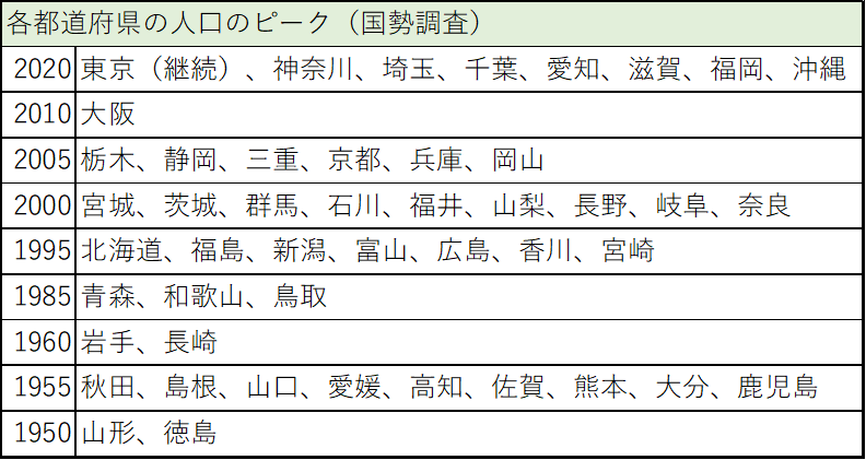 2025年に実施された国勢調査の結果は来年(2026年)公表されますが、東京都以外は減少に転じる見込みです。一方で、昭和時代にすでに人口のピークを迎えた県も16あり、中でも山形県と徳島県は1950年がピークでした。