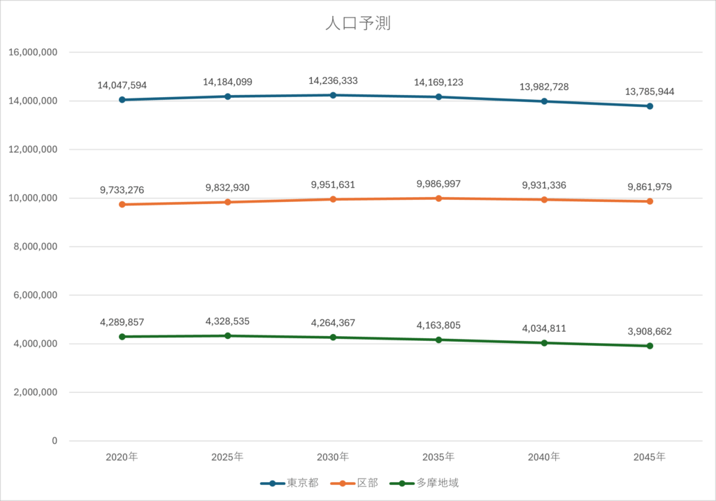 東京都の人口予測によると2030年にピークを迎えますが、多摩地域ではそれよりも早く、2025年を機に減少へ転じるとみられています。
