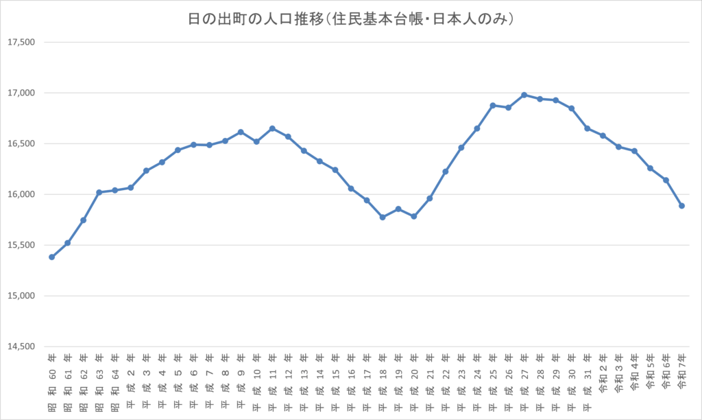 ここで、日の出町の人口推移について詳しく見ていきます。
