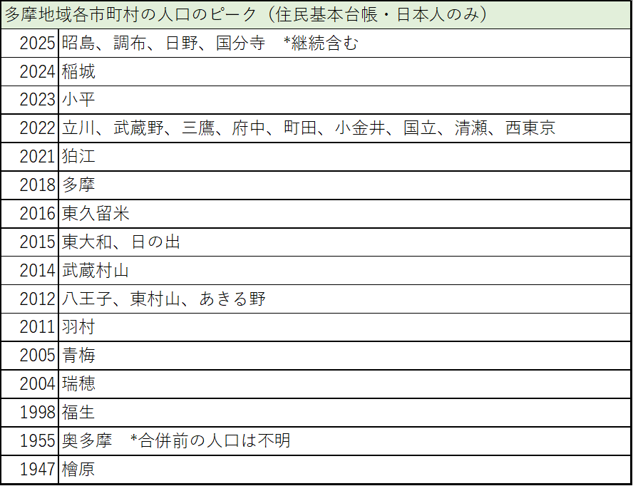多摩地域を見ると、概して西側のエリアほど早く人口減少が始まっています。檜原村や奥多摩町では昭和中期から減少が始まっており、西多摩全体で見ても、2015年(平成27年)にピークを迎えた日の出町を最後に、すべての市町村が減少局面に突入しました。その中で、昭島市がいまだに人口のピークを更新し続けている点は注目すべきポイントです。
