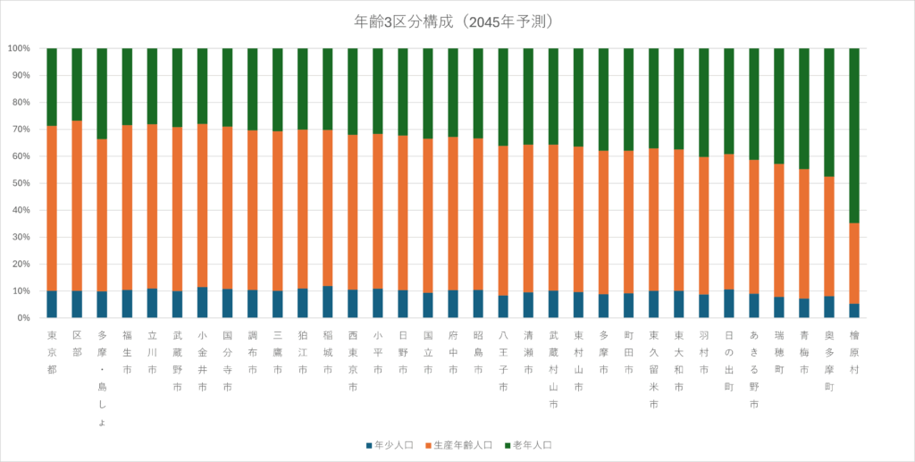 多摩地域全体としても、2045年には現在よりも生産年齢人口が約6%減少し、老年人口が約7%増加する見込みです。