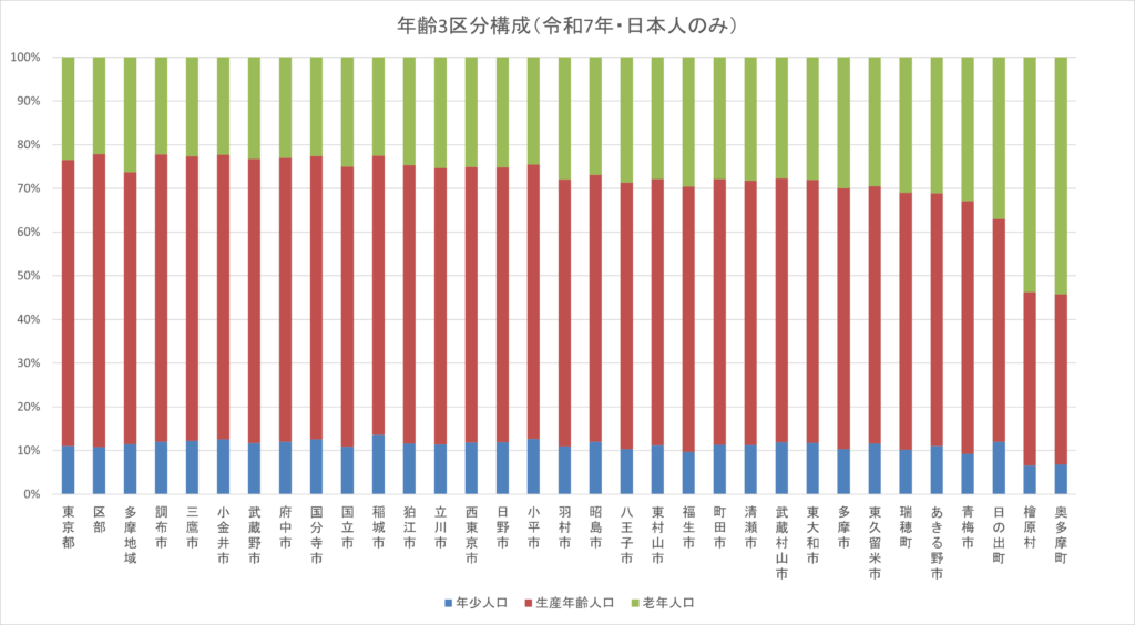 年齢構成については、多摩地域は東京都全体(特に区部)と比較して、老年人口の割合が増加しています。年少人口の比率は区部より多摩地域の方がやや高いものの、区部は生産年齢人口が約4.9ポイント高く、老年人口は約4.2ポイント低いという特徴があります。