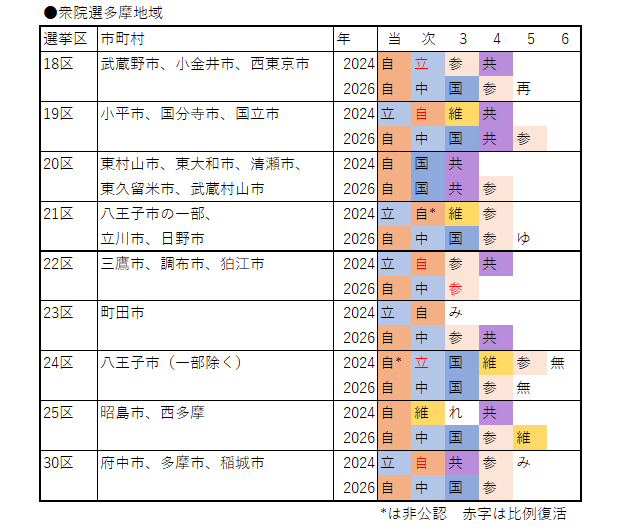 維新は前回擁立していた19区、21区、24区から撤退。多摩地域では唯一25区の維新が残った。25区以外は自民を支援している。