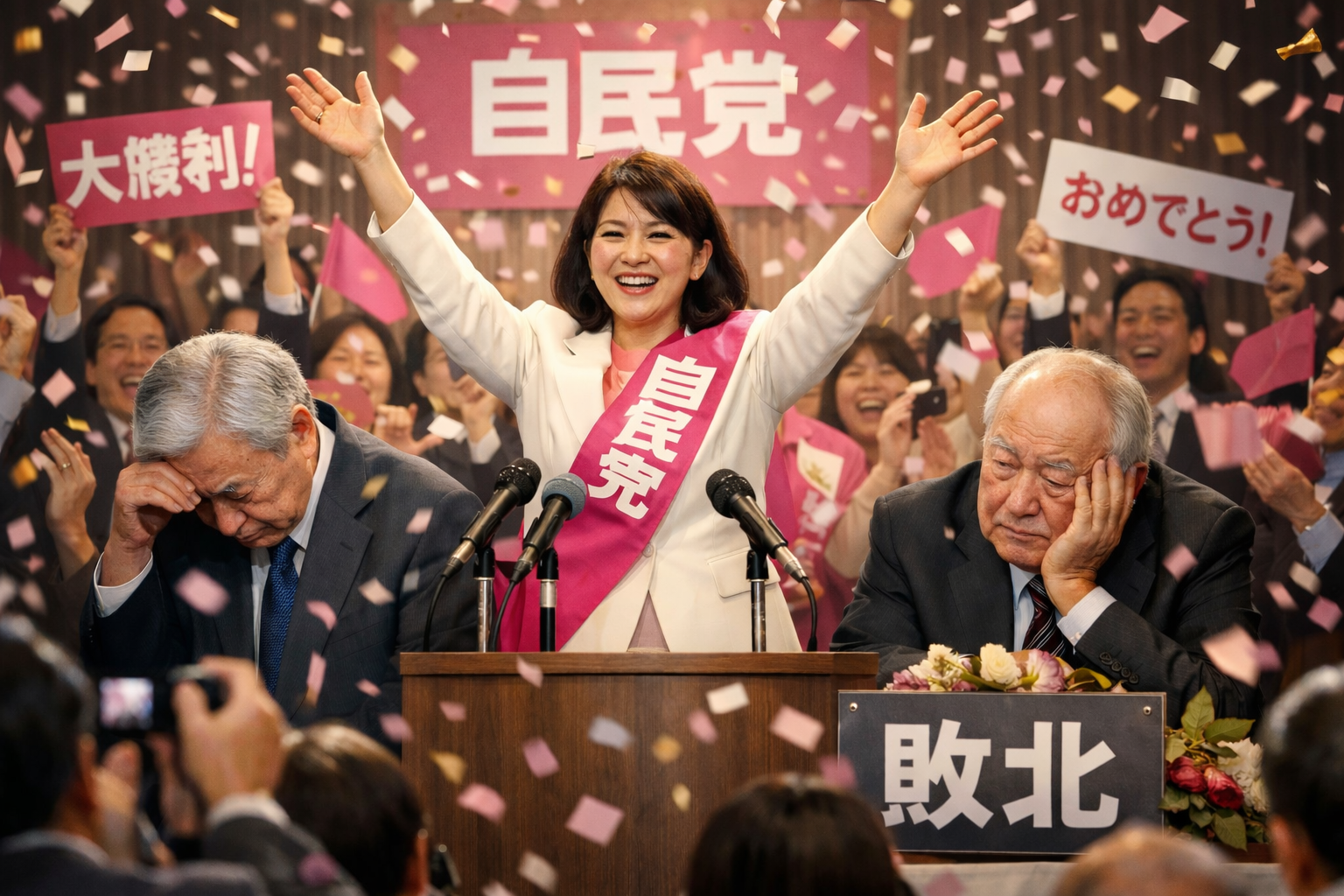 自民党が圧勝。自民単独で3分の2を超え過去最多議席となる歴史的大勝を収めた。また比例候補不足で14議席を他党へ譲った。衆院の3分の2に当たる議席は、参院が否決した法案について、衆院で再可決することができる勢力となる。